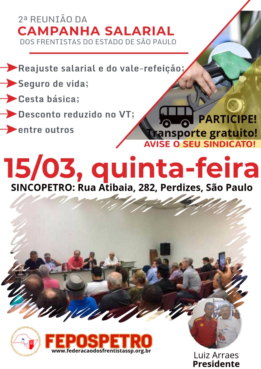 Agendada para as 14 horas desta quinta-feira (15), no Sincopetro, entidade patronal do estado, a reunião, aberta ao público, será no endereço: Rua Atibaia, num. 282, em Perdizes, SP,