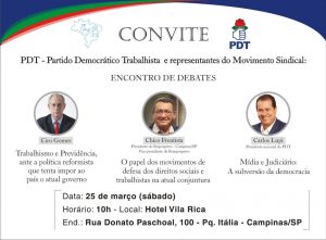 Ciro Gomes, ex-ministro e ex-governador do Ceará (PDT), é esperado em Campinas no dia 25, próximo sábado, para um “Encontro de Debates” em que falará sobre rumos do Trabalhismo e da Previdência Social, ante a atual conjuntura. Programado para as 10 horas, o evento, no Hotel Vila Rica, terá a participação de Carlos Lupi, presidente nacional do PDT, e de Francisco Soares de Souza ( Chico-Frentista), presidente do Sinpospetro-Campinas e o 1° vice- da Federação Nacional dos Frentistas – Fenepospetro. Confirmaram presença lideranças dos frentistas de diversas regiões do país sindicalistas de outras categorias, autoridades políticas e representantes de diversas entidades de defesa dos direitos dos trabalhadores.